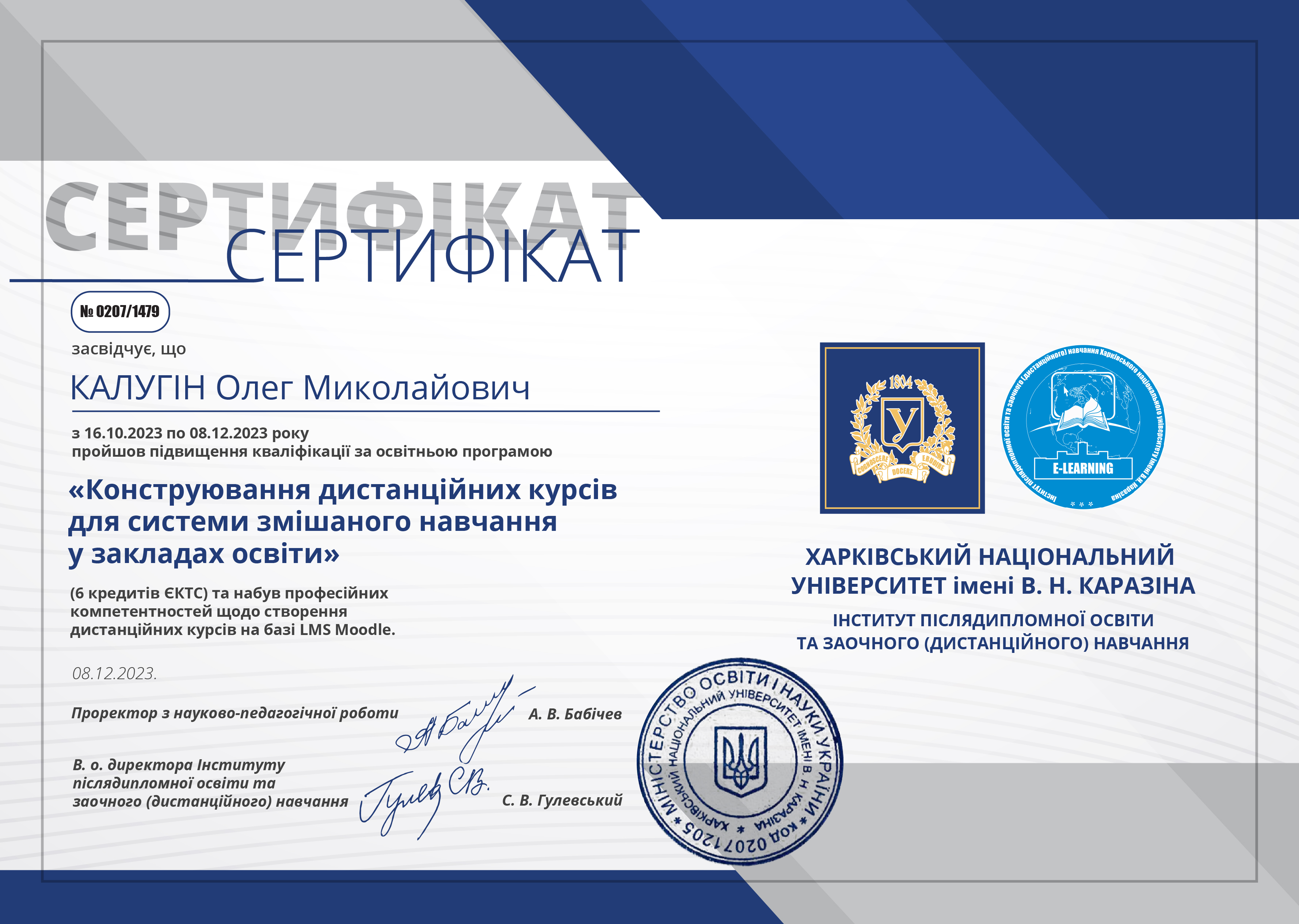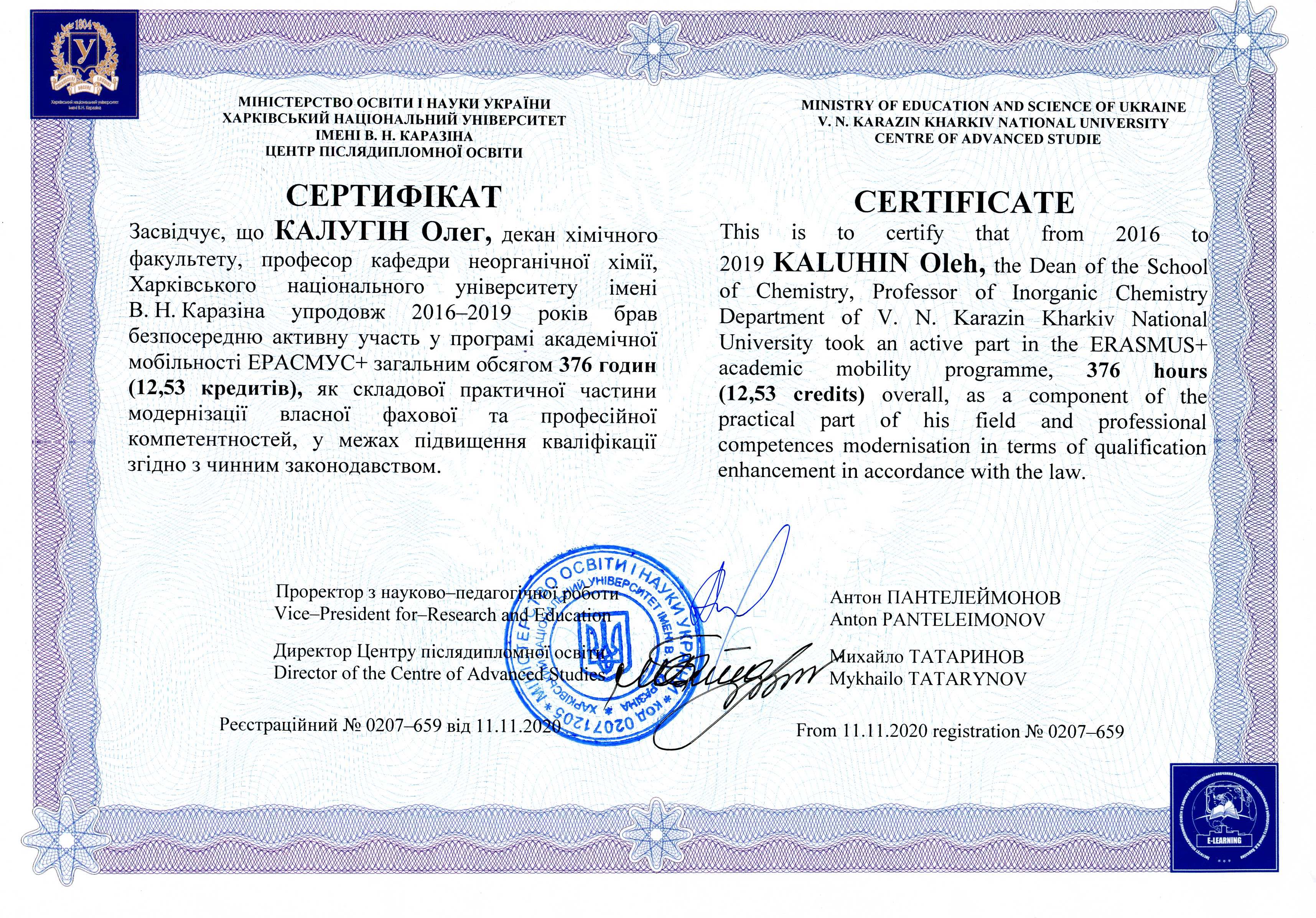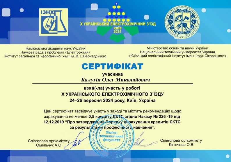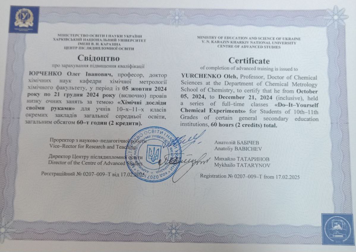Науково-дослідний інститут хімії, напрям «Хімія», з 02.11.2024 р. по 29.11.2024 р., 6 кредитів (180 год.) сертифікат 0207/1687 від 29.11.2024 р.