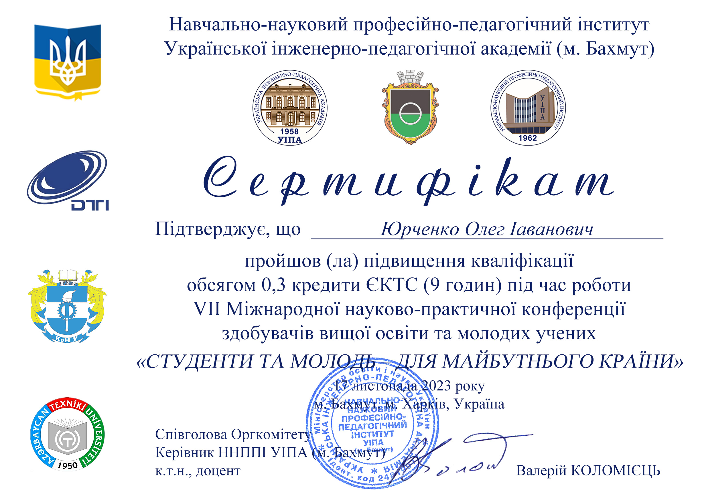 5. VІІ Міжнародна науково-практична конференція здобувачів вищої освіти та молодих учених «Студенти та молодь - для майбутнього країни» (17 листопада 2023 р., 9 годин )